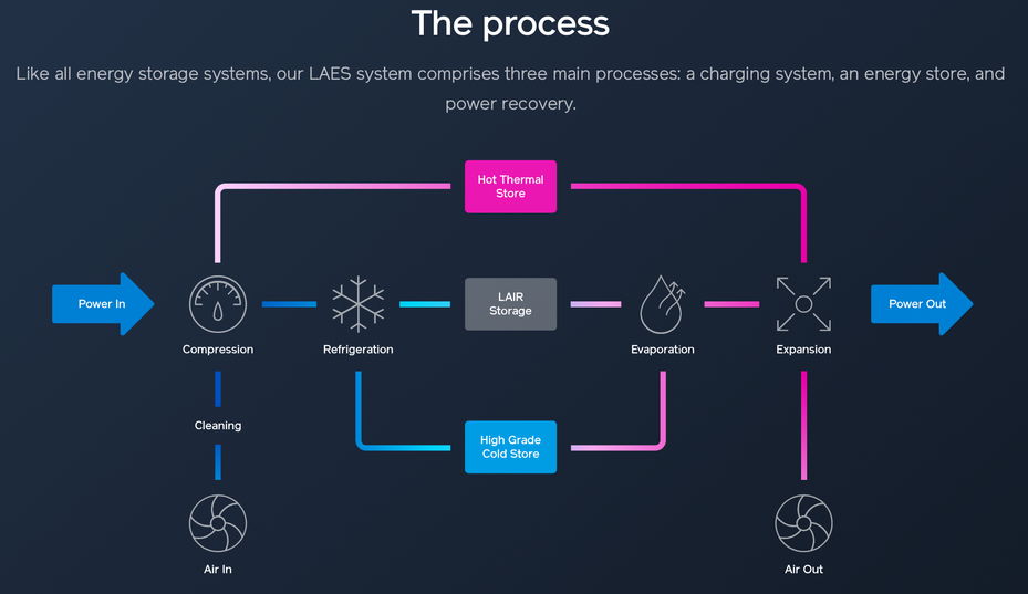 В Великобритании компания Highview Power запустила в эксплуатацию первый в мире промышленный сетевой накопитель энергии на основе сжиженного воздуха (Liquid air energy storage, LAES). Его мощность составляет 5 МВт, энергетическая емкость равна 15 МВт·ч — этого достаточно, чтобы снабжать электричеством 5 000 домохозяйств в течение 3 часов.