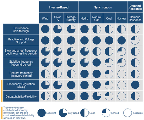 В статье согласно документам Североамериканской корпорации по надежности электроснабжения (NERC) выделяется 7 основных сетевых услуг, многие из которых ВИЭ способы предоставлять на высоком уровне. По оценке автора, все рассмотренные в статье услуги (в том числе регулирование напряжения реактивной мощностью, регулирование частоты, восстановление частоты на разных этапах системного сбоя и т. д.) солнечные и ветровые электростанции выполняют на «хорошо», «очень хорошо» и «отлично». В частности, функцию поддержания непрерывности электроснабжения при сбоях в сети (disturbance ride through capability), которая является на сегодняшний день одним из основных системных требований к генерирующему оборудованию, зафиксированных в электроэнергетических правилах и стандартах, ветровые и солнечные электростанции выполняют на «отлично» и «очень хорошо» — то есть лучше, чем традиционные генераторы. Таким образом, согласно выводу автора статьи, они являются ценным активом, который должен быть использоваться для повышения надежности энергоснабжения. [renen.ru]