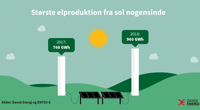 Dansk Energi отмечает, что в прошедшем году солнечные электростанции произвели рекордное для страны количество электроэнергии, их доля составила 2,8% потребления электроэнергии. Выработка фотоэлектрической солнечной энергетики выросла по сравнению с 2017 годом на 25% — с 768 ГВт·ч до 961 ГВт·ч.