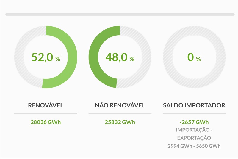 По данным португальского оператора электрических и газовых сетей (Redes Energéticas Nacionais), по итогам 2018 доля возобновляемых источников энергии потребления электроэнергии Португалии (включая чистый экспорт) составила 52%. Ветровые электростанции и ГЭС обеспечили по 23%, на биотопливо пришлось 5%, солнечная энергетика достигла 1,5%. Выработка электроэнергии на основе ископаемого топлива обеспечила 48% потребления (27% — природный газ, 21% — уголь). [ren.pt]