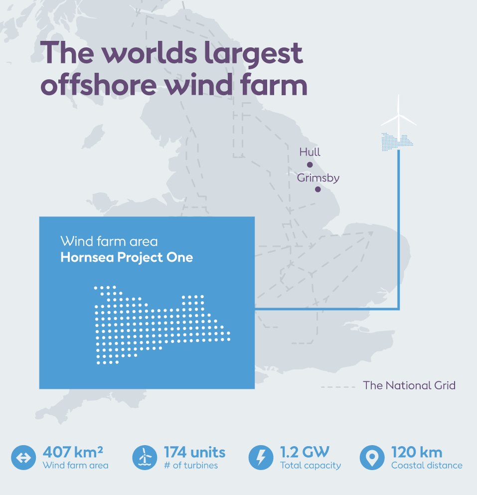 Датская компания Ørsted (ранее известная как DONG Energy) начала строительство самой крупной в мире морской ветровой электростанции Hornsea Project One мощностью 1,2 ГВт, которая будет расположена в 120 км от побережья Йоркшира (Великобритания). К установке планируется 174 ветротурбины. Ørsted утверждает, что электростанция сможет генерировать количество энергии, достаточное для снабжения миллиона британских домохозяйств. Завершение строительства ожидается в 2020 году.