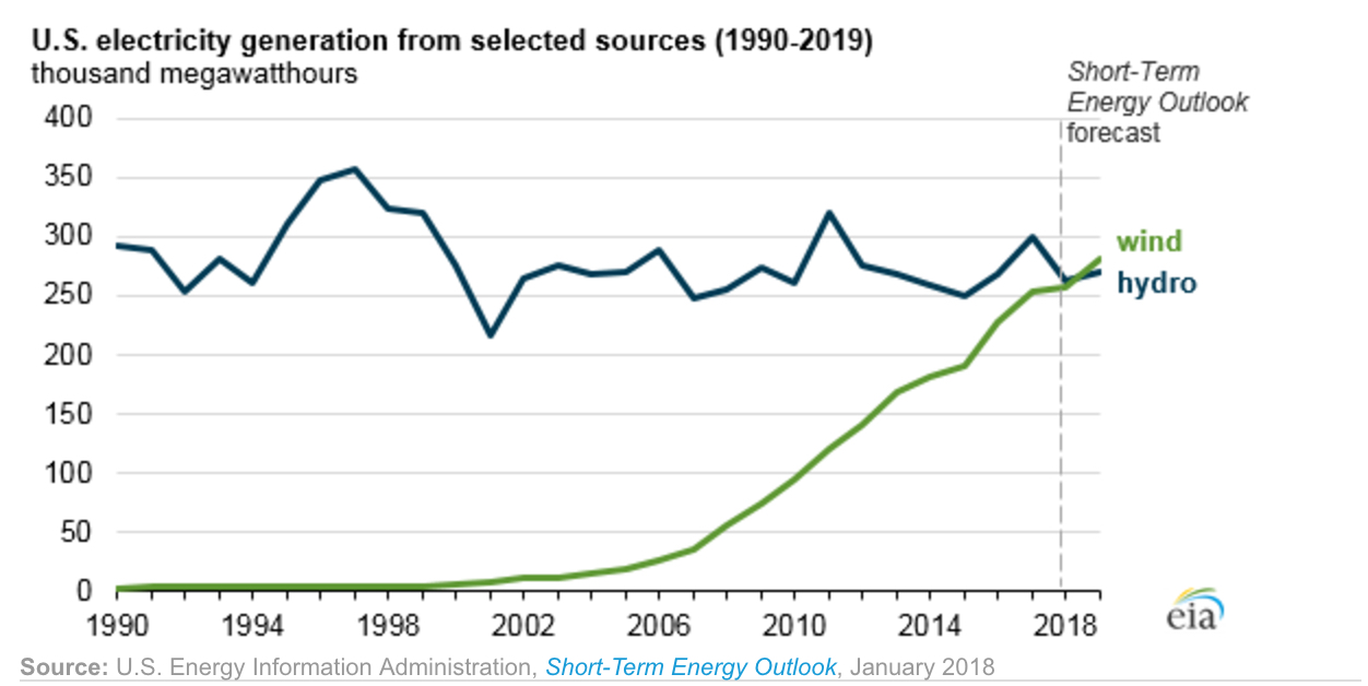 По прогнозам Управления по энергетической информации США (Energy Informaion Administration, EIA), в энергобалансе США к концу 2019 года доля электроэнергии, вырабатываемой ветровыми турбинами, превысит выработку гидроэлектростанций. EIA отмечает, что по планам в 2018 году мощности ветроэнергетики возрастут на 8,3 ГВт в 2018 году и на 8 ГВт в 2019 году, в то время как планы по введению новых мощностей в гидроэнергетике довольно смутные — соответствующей информации ведомство не предоставляет.