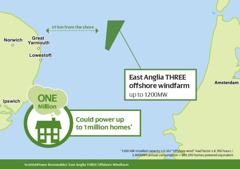 Компания ScottishPower Renewables получила разрешение властей Великобритании на строительство офшорного ветропарка в британских водах. Морская электростанция «East Anglia THREE» мощностью 1,2 ГВт будет включать в себя 172 ветряные турбины. Электроэнергии, производимой этой станцией, будет достаточно для снабжения чуть менее 900 000 домохозяйств. Объект будет расположен в 69 километрах к востоку от британского побережья и займет площадь около 305 км². Начало строительство запланировано на 2022 год, окончание — на 2025. [scottishpowerrenewables.com]