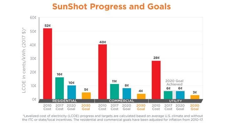 Американская Национальная лаборатория возобновляемой энергетики (NREL), швейцарский Центр электроники и микро-технологий (CSEM) и Политехнический институт в Лозанне (EPFL) совместно разработали и протестировали ряд многопереходных солнечных ячеек, чья эффективность достигла 35,9%. Соответствующая статья была опубликована в журнале Nature. Двухпереходный солнечный элемент, скомпонованный из сконструированной NREL верхней ячейки из арсенида галлия (GaAs) и кремниевой гетеропереходной ячейки, разработанной CSEM, показал эффективность в 32,8%. Ячейка с тройным переходом, к которой был добавлен слой фосфата галлия индия (GaInP), достигла эффективности в 35,9%. Предыдущий рекорд (достигнутый этой же исследовательской группой в 2016 году) составлял 29,8%. «Это достижение значимо, поскольку оно впервые показывает, что тандемные ячейки на основе кремния, могут обеспечить эффективность, конкурирующую с более дорогими многопереходными ячейками», — отметил Адель Тамболи из NREL. [renen.ru, nrel.gov]Средняя стоимость солнечной энергии в США упала ниже $1 за ватт