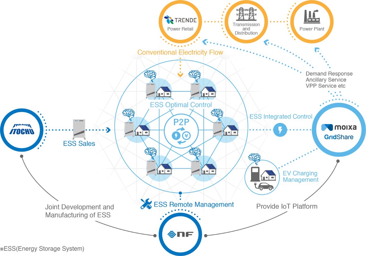 Цитата: «Переклички с архитектурой интернета энергии IDEA налицо: ITOCHU выпускает технику для энергетических ячеек, совместимую с общей системой, NF предоставляет IoT-систему для автоматического удаленного доступа и выдачи команд, TRENDE — сервис (App) для работы с розничным рынком, MOIXA — сервис (App), управляющий накопителями и взаимодействующий с App рынка от TRENDE.