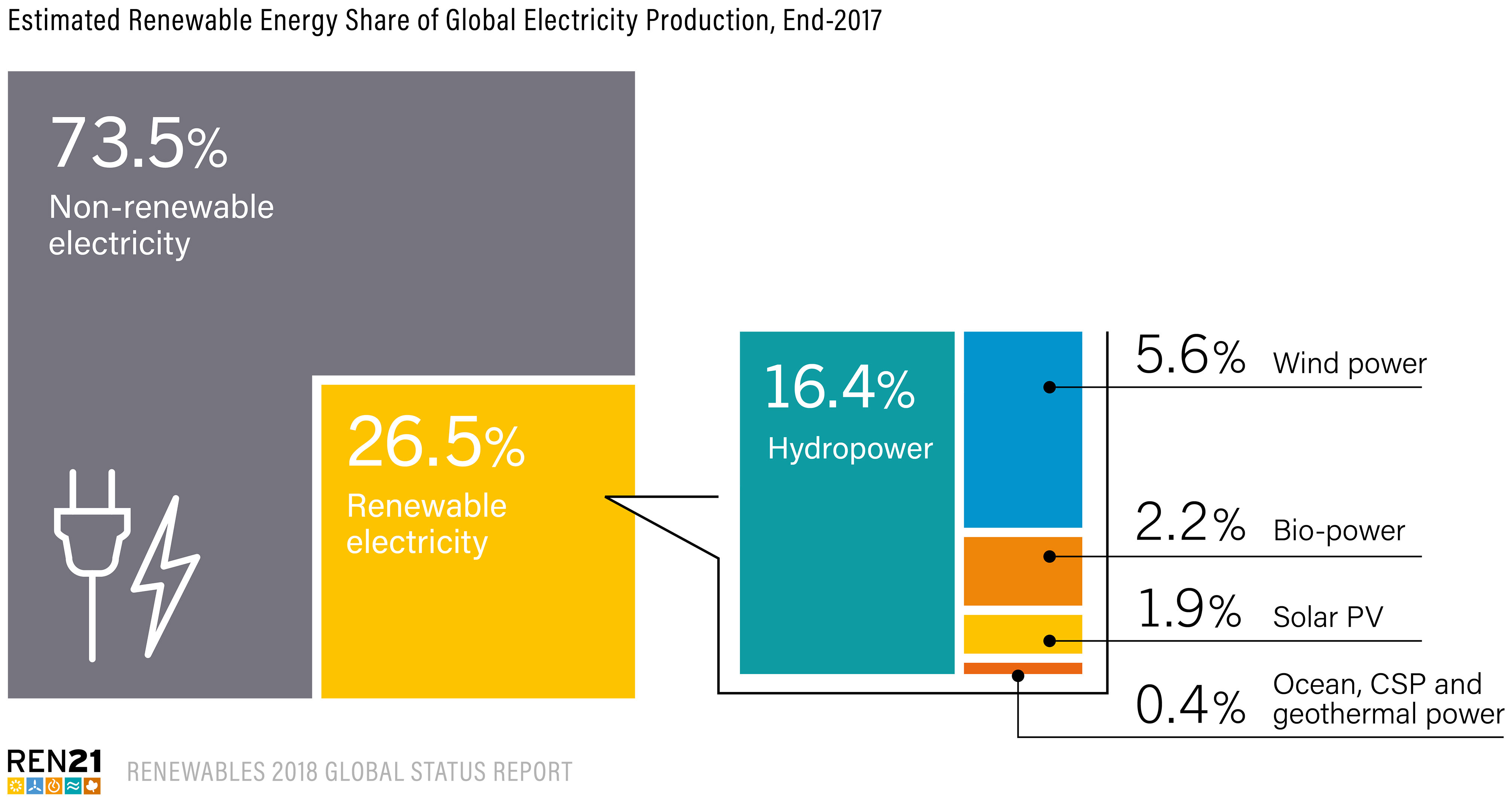 Ассоциация REN21 опубликовала традиционный ежегодный доклад о состоянии ВИЭ в мире Renewables 2018 Global Status Report. В докладе отмечается рекордный рост ВИЭ за прошедший год. Однако подчеркивается, что, несмотря на бум «зеленой» энергетики глобальное потребление энергии и выбросы углекислого газа впервые за 4 года существенно выросли: на 2,1% и 1,4% соответственно, что в значительной степени нивелирует успехи развития возобновляемой энергетики. ВИЭ на данный момент не способны покрыть такие объемы потребления. В прошлом году установленная мощность электростанций, работающих на основе ВИЭ, увеличилась почти на 9% по сравнению с 2016 годом — до 178 ГВт, что представляет собой рекордный прирост. Фотоэлектрические СЭС обеспечили 55% этого прироста (98 ГВт): только в секторе солнечной энергетики было создано больше новых мощностей, чем в генерации на основе ископаемого топлива и в атомной энергетике вместе взятых.