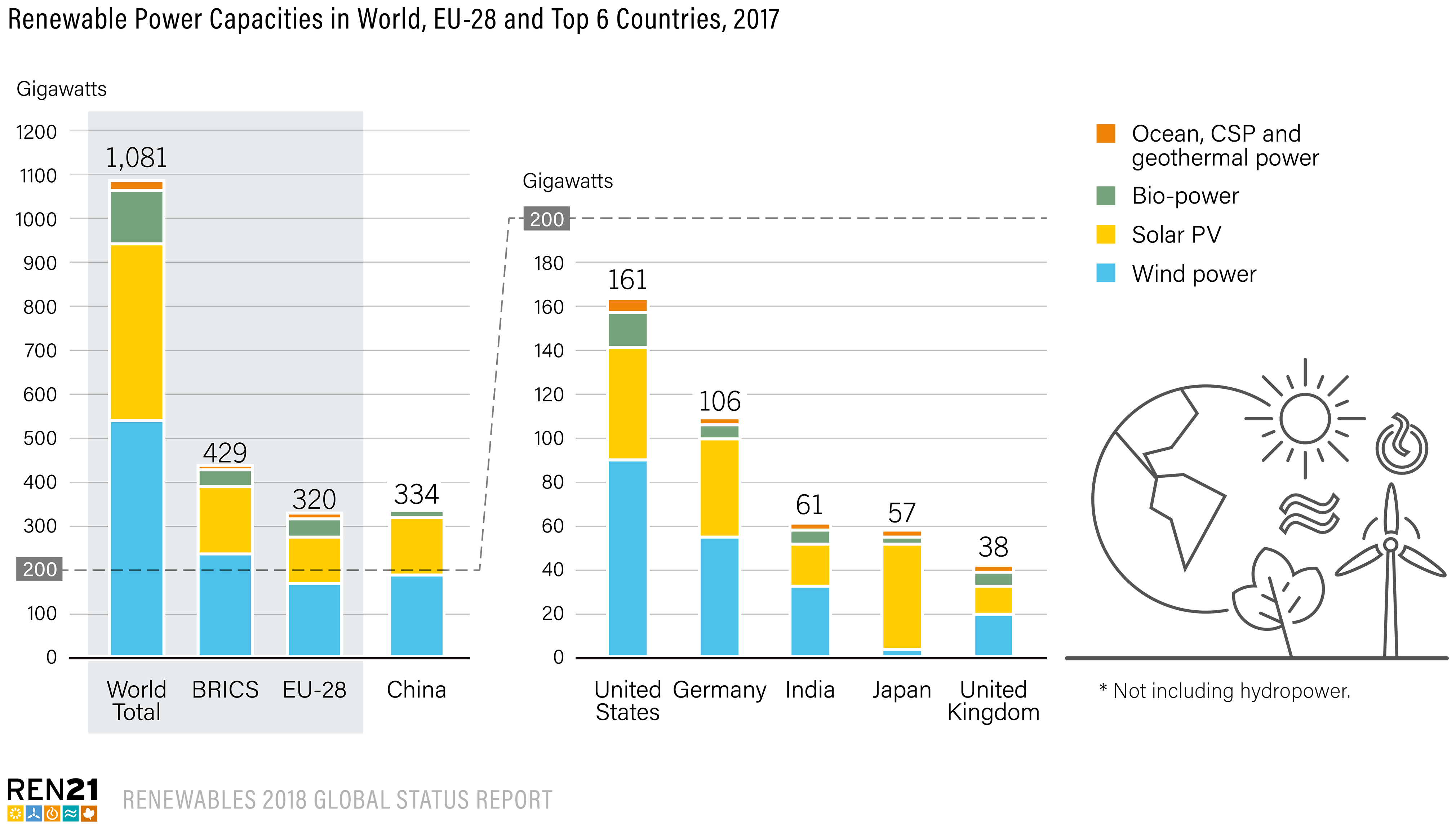 Мощности ВИЭ по миру, ЕС и лидирующим в секторе странам / REN21